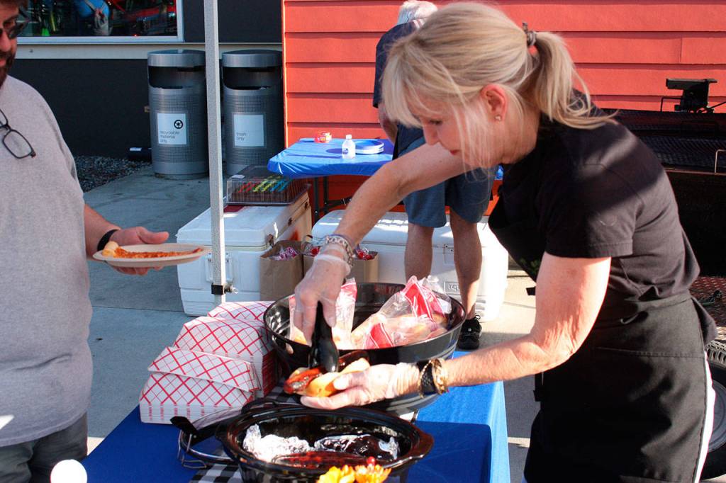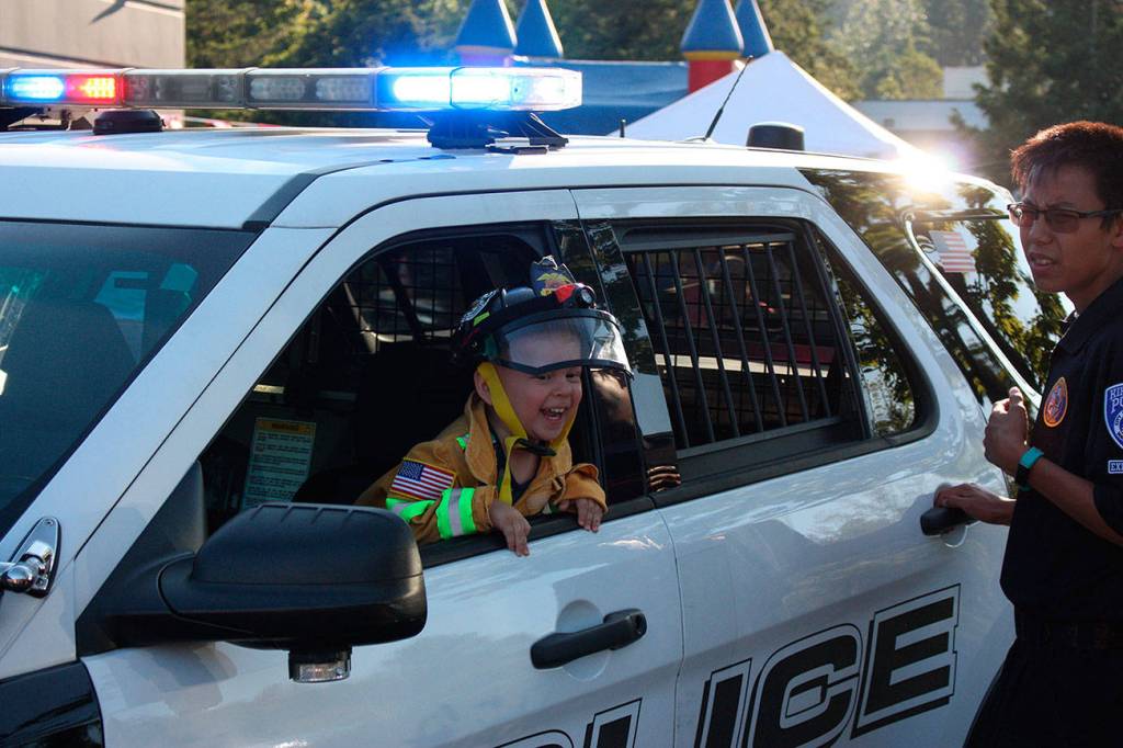 Kirkland held its National Night Out event on Aug. 6 at the Kirkland Justice Center in Totem Lake. Volunteer Leslie Tinti was busy serving hot dogs as children had a chance to climb inside police vehicles.
