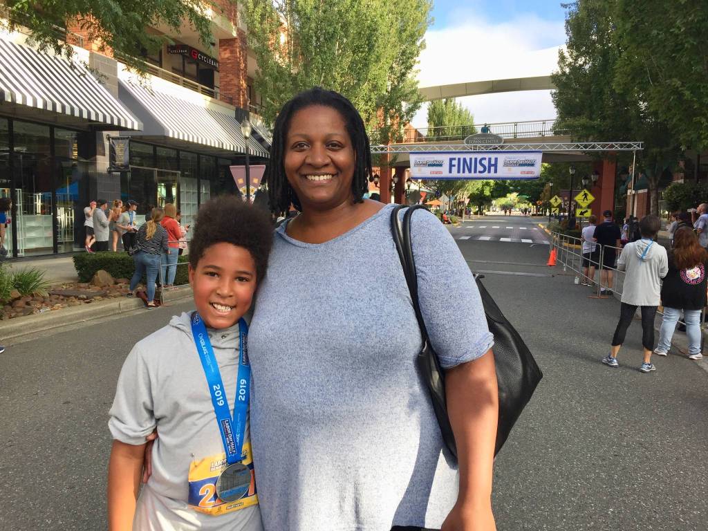 Rose Hill Elementary School fourth-grader Jackson Gallop completed his first 5K run at the Overlake Labor Day Half at Redmond Town Center. He’s pictured with his mom, Brenda Leaks. Gallop finished the race in 40 minutes and ran as part of his training to become a martial arts black belt. He plans to continue running at the Wonder Woman race on Oct. 6 at Marymoor Park. Photo courtesy of Hilary Benson
