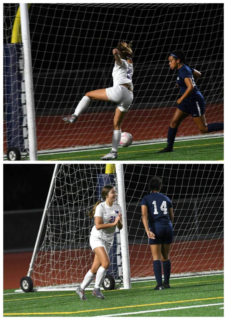 Goal and celebration: Kylie Jones, left, scores for Lake Washington in its 5-1 victory over Interlake on Sept. 24. Also pictured is Interlake’s Olivia Vidal. For LW, Jones netted two goals, and Allie Pollard, Ellie Pederson and Savannah Walenczak had one each. Photos courtesy of Dale Garvey