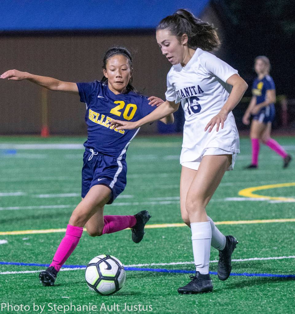 Juanita defender Noelle Hall (16) and Bellevue midfielder Hinana Takashima (20) go for the ball during the Rebels’ 1-0 loss on Oct. 1. Photo courtesy of Stephanie Ault Justus