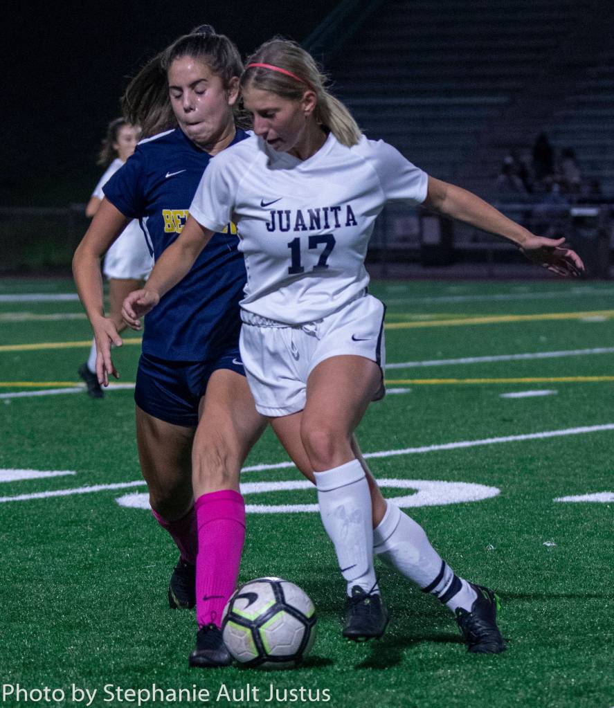 Juanita defender Kayla Huff shields the ball during a 1-0 loss to Bellevue on Oct. 1. Photo courtesy of Stephanie Ault Justus
