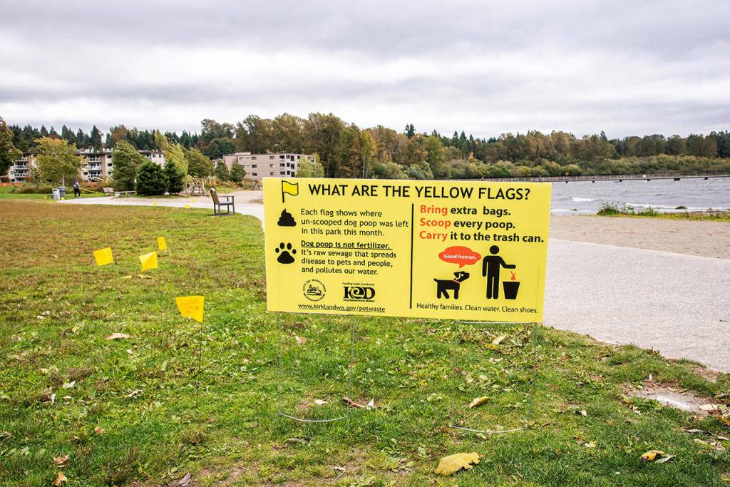Visitors to Juanita Beach Park and Hazen Hills Park may have noticed bright yellow survey flags indicating where un-scooped dog poop was discovered during a three-week observation period in September. According to a press release, city staff marked 66 instances of un-scooped poop along the shoreline of Juanita Beach, with another 105 cases on the north side of the park. Ninety-four cases were documented at Hazen Hills Park in the Evergreen Hill neighborhood.