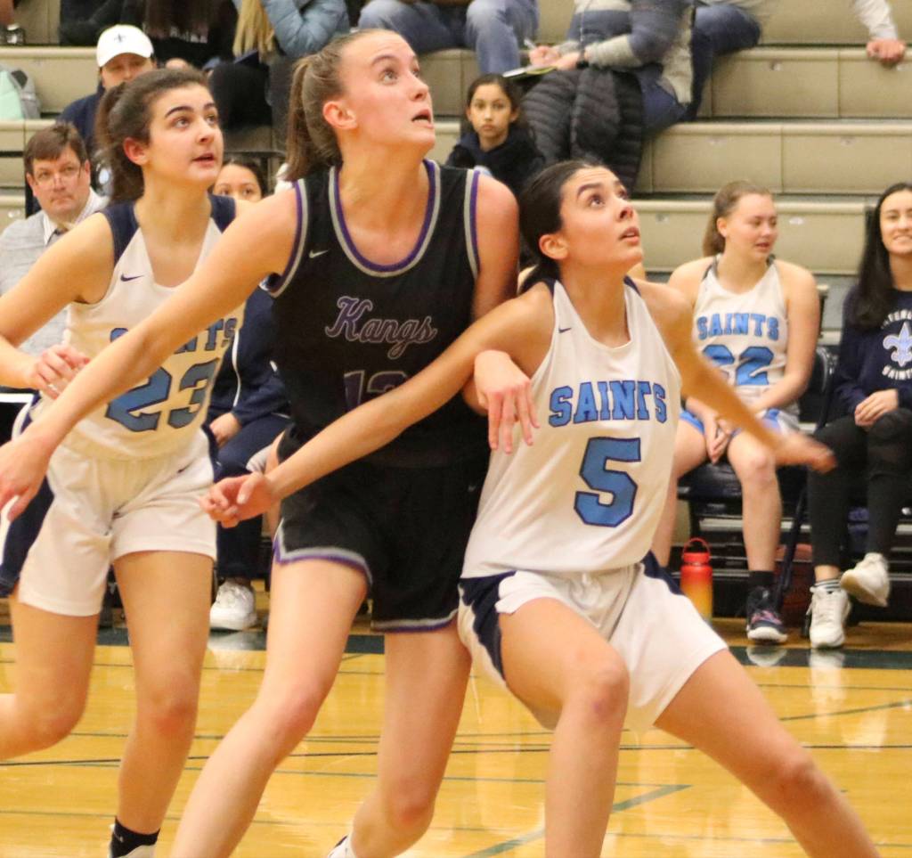 Lake Washington sophomore Elise Hani (middle) and Interlake senior Mia Robertson jostle for position of a rebound on Dec. 11. Benjamin Olson/staff photo