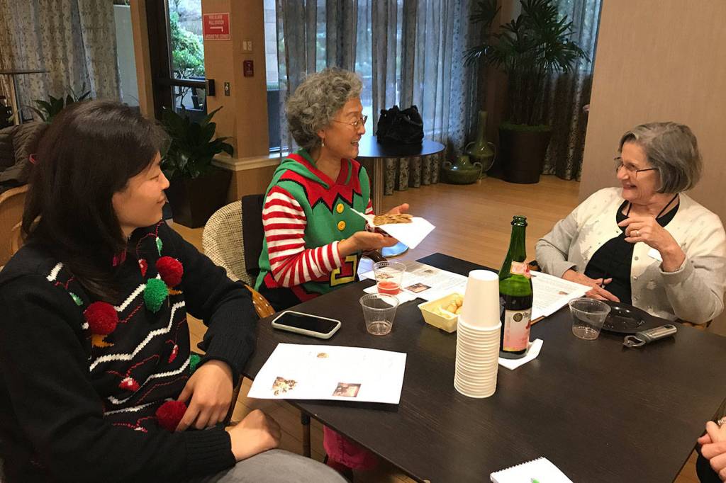 From left, James Yang and Maria Lanz discuss holiday treats during the last Talk Time class before Christmas at Aljoya Mercer Island. Samantha Pak/staff photo