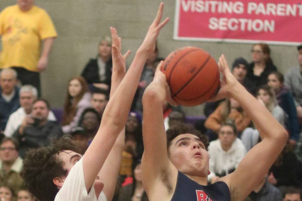 Juanita’s Beckham Lie (right) reaches toward the hoop as Lake Washington’s Jackson Pribic defends during the Kangs’ 52-43 boys basketball victory on Feb. 7. LW led 39-28 after three quarters and Juanita cut the Kangs’ lead to 40-35 with 6:16 left in the game. LW pulled away from there to secure the victory. Andy Nystrom/ staff photo
