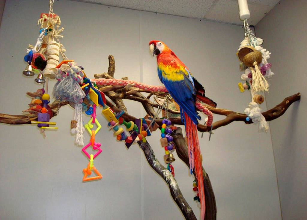 Tiki was never caged. In the store, she had a large, open perch in a corner of the store. Customers would interact with her and take pictures.