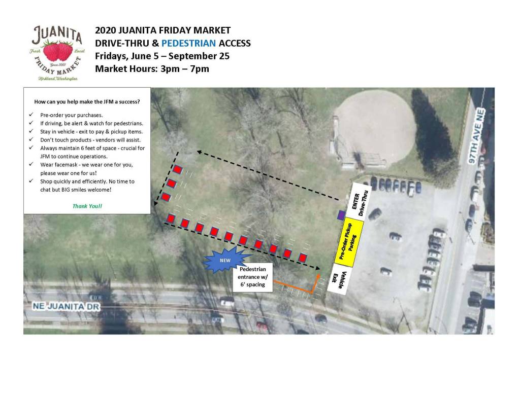 On Friday, June 12, Kirkland residents can now walk through the Juanita Friday Market— with some social distancing guidelines in place. The market, which started last week with drive-thru access only and the ability to pre-purchase from vendors, is open every Friday 3 to 7 p.m. until Sept. 25 at 9703 Northeast Juanita Drive.