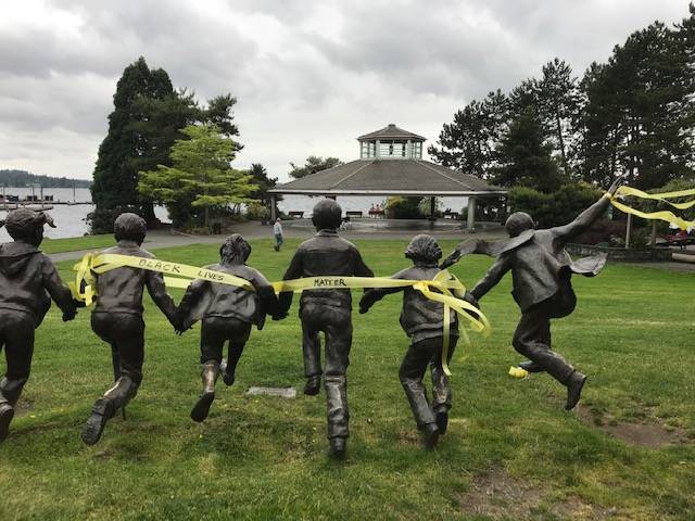 At the statue featuring several children, yellow ribbon has been placed around them with “Black Lives Matter” written on it. Earlier in the year blue ribbons were added to the statue and trees throughout the city to spread hope during the COVID-19 pandemic and the tragic outbreak at Kirkland Life Care Center.