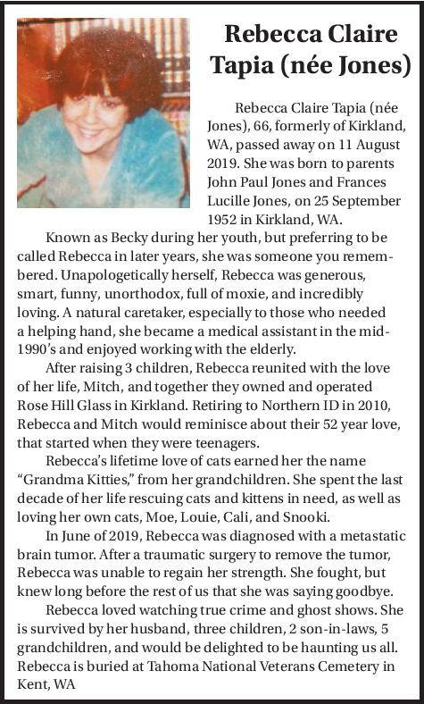 Rebecca is buried at Tahoma National Veterans Cemetery in
