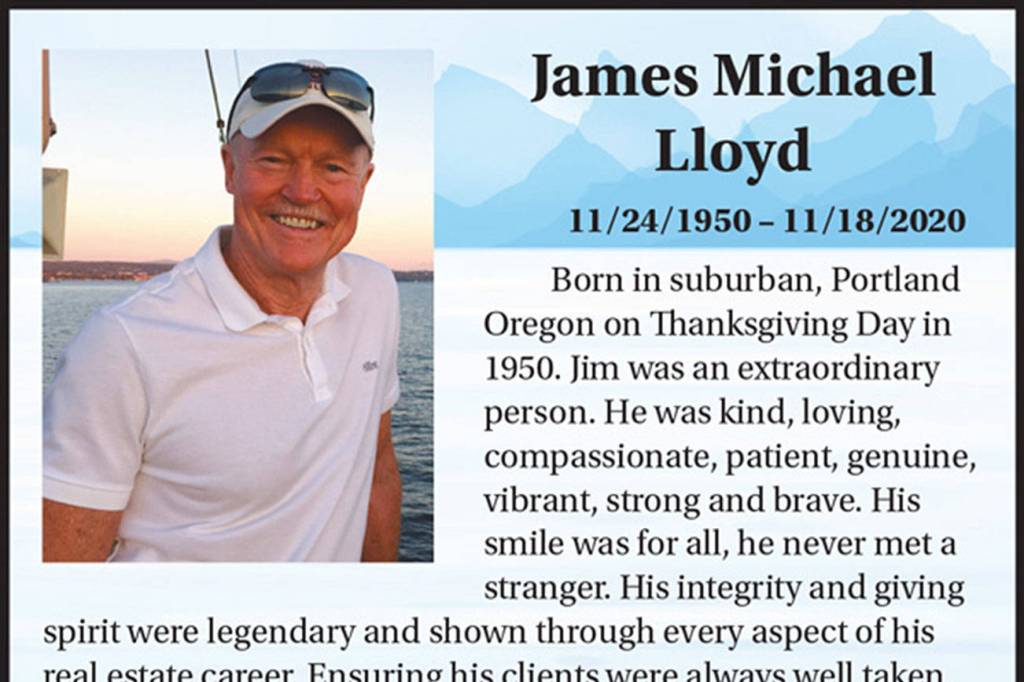 Born in suburban, Portland Oregon on Thanksgiving Day in 1950. Jim was an extraordinary person. He was kind, loving, compassionate, patient, genuine, vibrant, strong and brave. His smile was for all, he never met a stranger. His integrity and giving spirit were legendary and shown through every aspect of his real estate career. Ensuring his clients were always well taken care of was more important to Jim than the sale itself. His zest for life was an inspiration to many. His love and devotion for family, friends and community was incomparable as was his love for fitness and the outdoors. He was a standout athlete, an avid sailor, runner, hiker, biker, swimmer and skier. ALS hit him in 2017. He fought the fight against this brutal disease with courage, grace and determination. He made his transition November 18, 2020, at home in Kirkland just before his 70th birthday. Kristen, Berna, Amanda and Savana were with him as he took his last breath and drifted peacefully to his forever rest. Free of ALS. Free to bike, hike, run and swim in paradise.