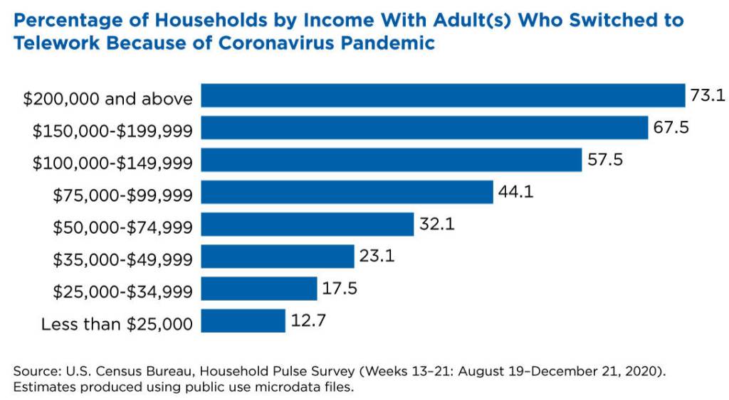 Since August 2020, the U.S. Census Bureau has asked participants in the Household Pulse Survey: “Working from home is sometimes referred to as telework. Did any adults in this household substitute some or all of their typical in-person work for telework because of the coronavirus pandemic, including yourself?”