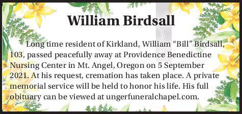 Long time resident of Kirkland, William “Bill” Birdsall, 103, passed peacefully away at Providence Benedictine Nursing Center in Mt. Angel, Oregon on 5 September 2021. At his request, cremation has taken place. A private memorial service will be held to honor his life. His full obituary can be viewed at ungerfuneralchapel.com.