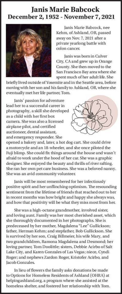 Janis Marie Babcock, nee Kehm, of Ashland, OR, passed away on Nov. 7, 2021, after a private yearlong battle with colon cancer.