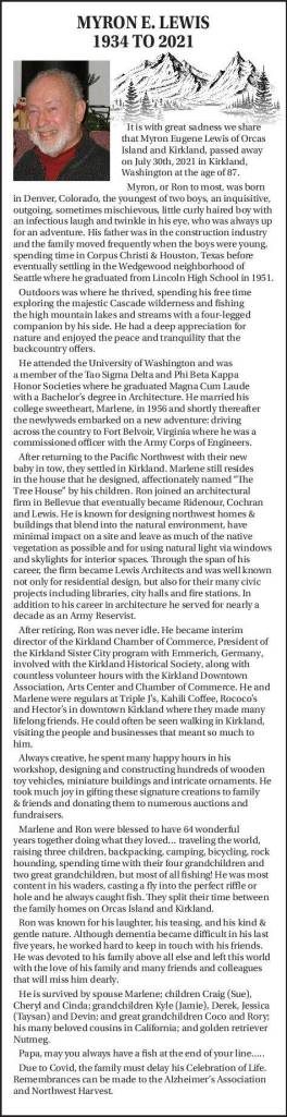 It is with great sadness we share that Myron Eugene Lewis of Orcas Island and Kirkland, passed away on July 30th, 2021 in Kirkland, Washington at the age of 87.
