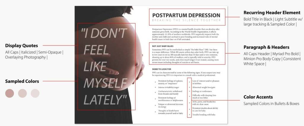 The factsheet was the first asset designed and set the visual aesthetic for the entire campaign. Nude colors were chosen to express a level of vulnerability, and photographs were paired with quotes that approximated what was being expressed through research.