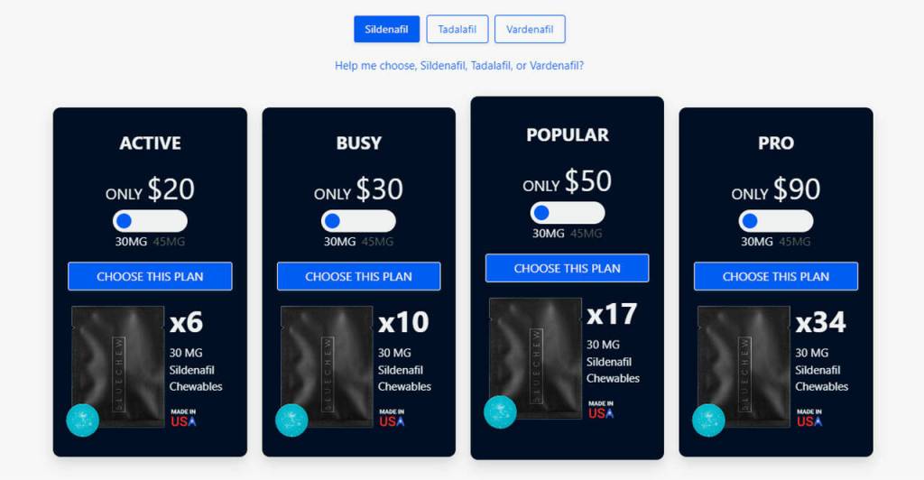 Bluechew offers ED products that contain one of two active ingredients – sildenafil or tadalafil.