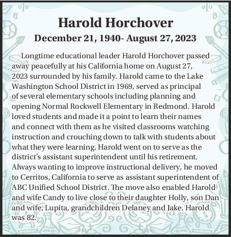 Longtime educational leader Harold Horchover passed away peacefully at his California home on August 27, 2023 surrounded by his family. Harold came to the Lake Washington School District in 1969, served as principal of several elementary schools including planning and opening Normal Rockwell Elementary in Redmond.