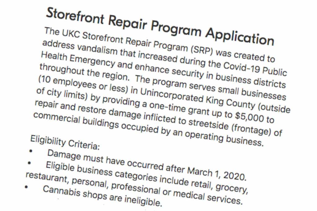 A new grant program is available to small businesses in unincorporated King County that have experienced vandalism or break-ins since the COVID-19 pandemic began in March 2020.