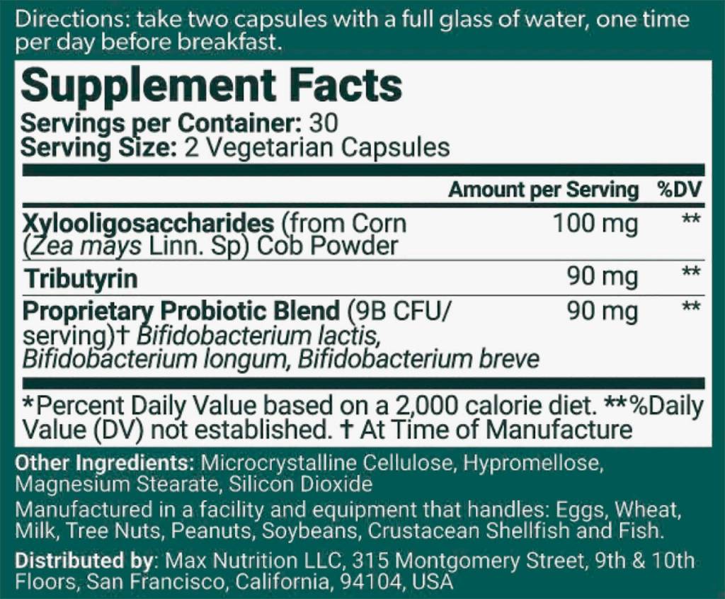 Xylooligosaccharides, Tributyrin, Proprietary Probiotic Blend (Bifidobacterium lactis, Bifidobacterium longum, Bifidobacterium breve), Microcrystalline Cellulose, Hypromellose, Magnesium Stearate, Silicon Dioxide