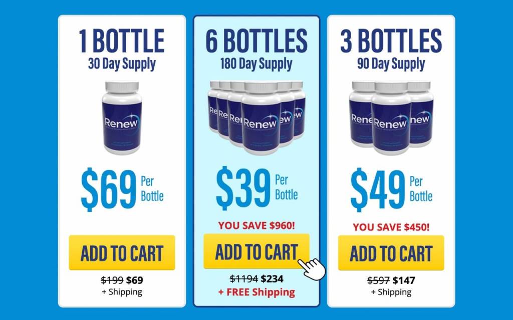 - For an extended 180-day supply, the 6-bottle package offers Renew at $39 per bottle, granting exceptional savings of $960. Additionally, this package includes free shipping, providing a cost-effective and efficient way to experience the transformative benefits of Renew over a more extended period.
