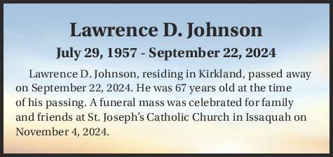 Lawrence D. Johnson, residing in Kirkland, passed away on September 22, 2024. He was 67 years old at the time of his passing. A funeral mass was celebrated for family and friends at St. Joseph’s Catholic Church in Issaquah on November 4, 2024.