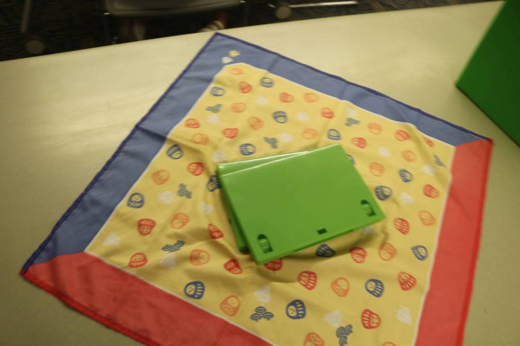 Led by Lynn Shiori Miyauchi, the Consulate’s Senior Specialist for Cultural Affairs Sister Cities & Public Outreach, everyone in the class was provided with empty bottles, empty DVD cases, medium-sized sports balls and a furoshiki with bright colors and cute designs on one side.