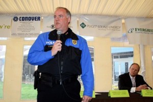 Kirkland Police Chief Eric Olsen addresses a crowd of nearly 100 as he discusses crime in Kirkland during a Kirkland Chamber of Commerce luncheon at the Woodmark Hotel Tuesday. Also pictured is King County Prosecutor Dan Satterberg.
