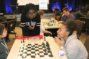 Youth receive chess tips from internationally renowned Ugandan woman and Northwest University student.