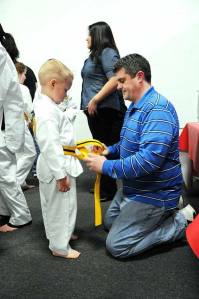 Traxton Allen watches as his father fastens the boy's new belt during an Elite Martial Arts awards ceremony on March 2.