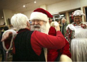 Santa reaches out to hug Rebecca Willow during a holiday celebration to benefit KITH at Parkplace Books.
