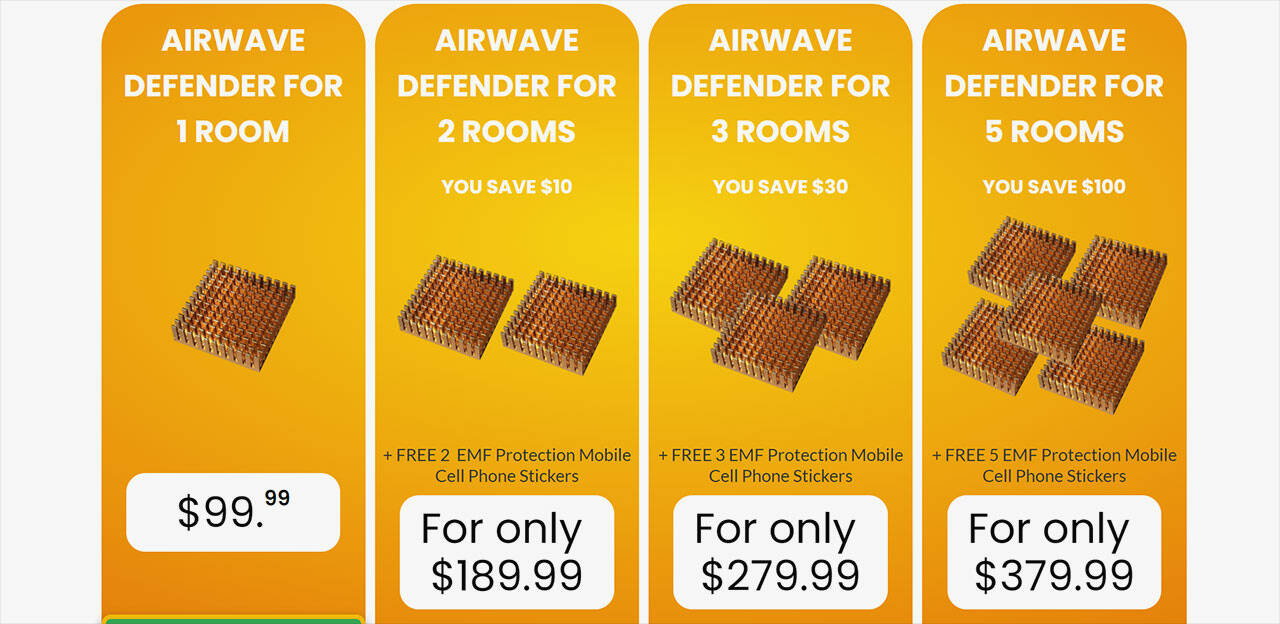 - Airwave Defender for three rooms at $279.99 +3 EMF Protection Mobile Cell Phone Stickers