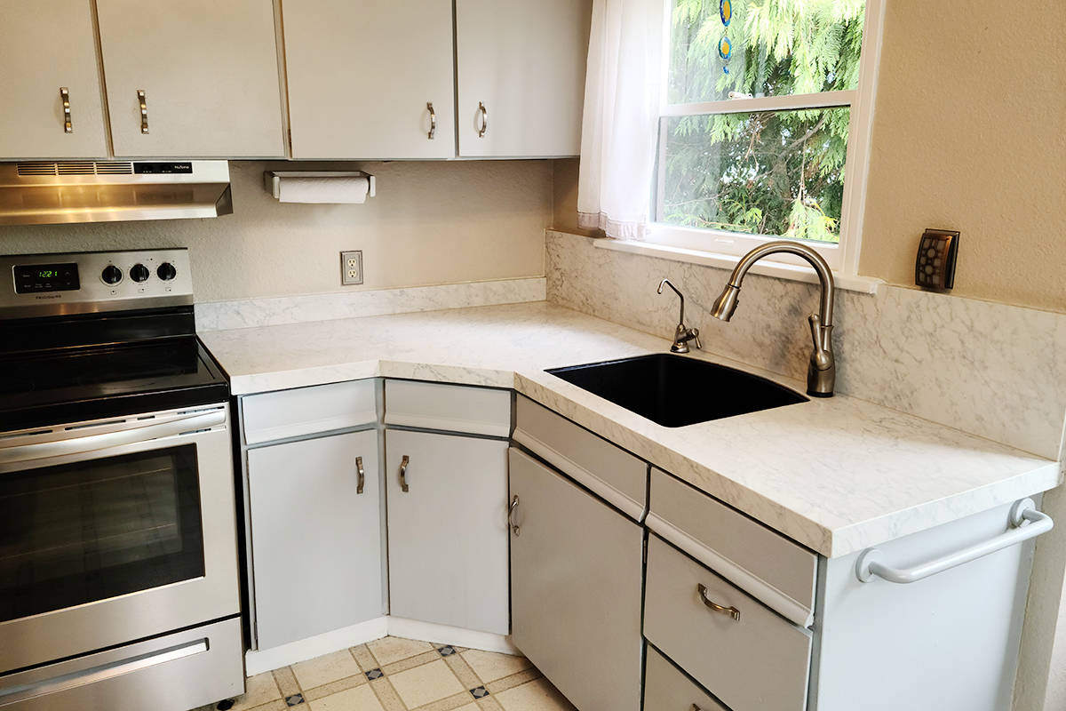 Maintaining the functional layout and existing, solidly built cabinets, the team installed new countertops – thankfully replacing royal blue swimming pool tiles from the early 1980s.