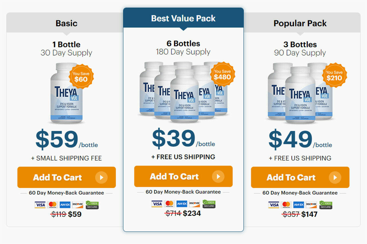 The only way to get the authentic TheyaVue supplement is by visiting the official website, which has three different packages. The average retail value of TheyaVue is $119, but users who shop online now won’t have to pay anything close to that amount.