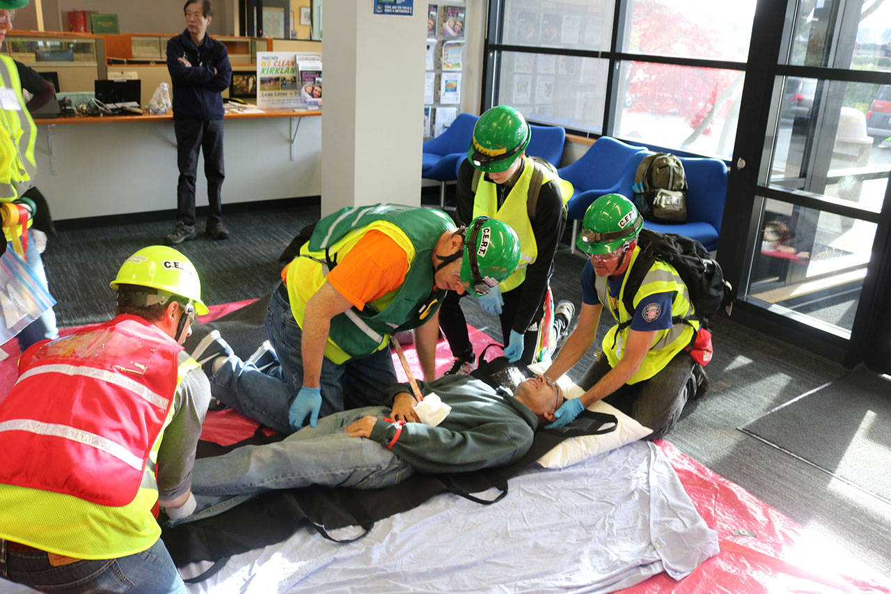 Screams filled the hallway off of the Peter Kirk Room in Kirkland City Hall last week. A major earthquake had hit the area and left the building without power. The sounds of the injured echoed off the walls as Kirkland’s 24th Community Emergency Response Team organized and got to work, conducting search and rescue efforts for the wounded.