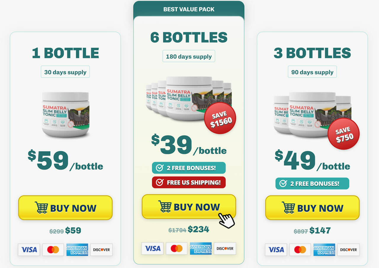 You can buy the Sumatra Slim Belly Tonic supplement online through the official website only. There are different pricing options and discounts depending on the number of canisters you buy. The company offers free shipping when you order over six Sumatra Slim Belly Tonic bottles.