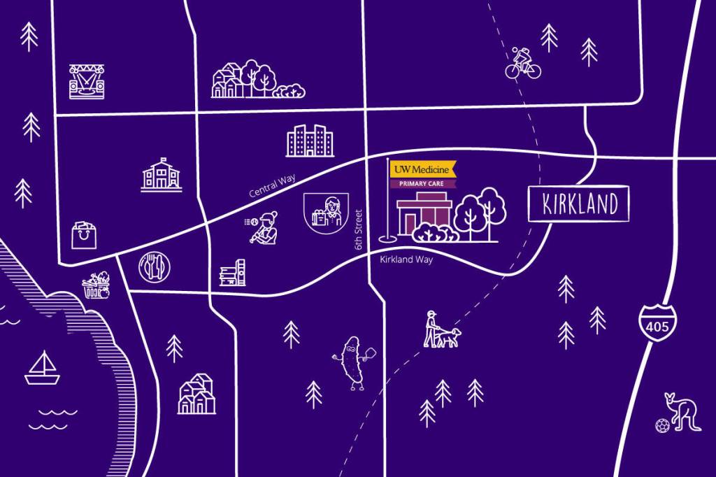 UW Medicine Primary Care at Kirkland is in the Jewel Building at 620 Kirkland Way, three blocks from the Kirkland Transit Center. Patients in Eastside neighborhoods also have easy access from I-405 and SR-520. Free parking is available.
